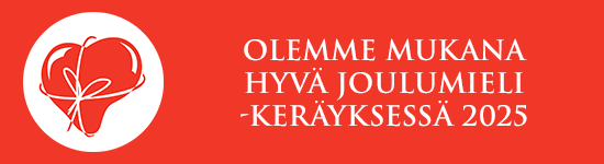 Lahjoitimme tänä jouluna kaikki joulumuistamisemme Hyvä joulumieli-keräykseen. Hyvä joulumieli -keräys Mannerheimin Lastensuojeluliitossa ja Suomen Punaisen Ristin yhdessä Ylen kanssa toteuttama keräys kotimaan vähävaraisten lapsiperheiden hyväksi.